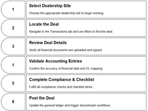 Deals Posting is the process of recording finalized vehicle sales into the dealership’s accounting system. It ensures that all financial aspects of a deal—such as vehicle cost, sales price, taxes, fees, commissions, and financing—are accurately reflected in the books.