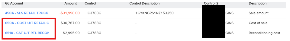The primary GL header account for each vehicles sold. Sale Amount represents the total value of goods or services sold to customers. Cost of Sale represents the direct cost of producing or purchasing the goods sold.