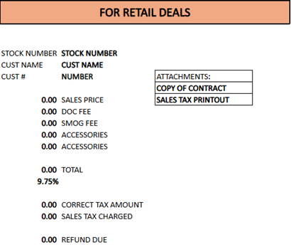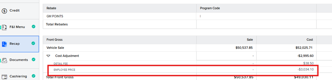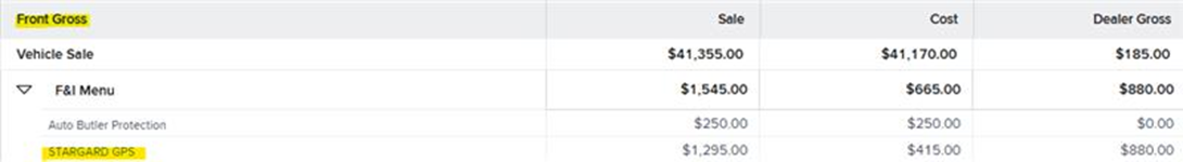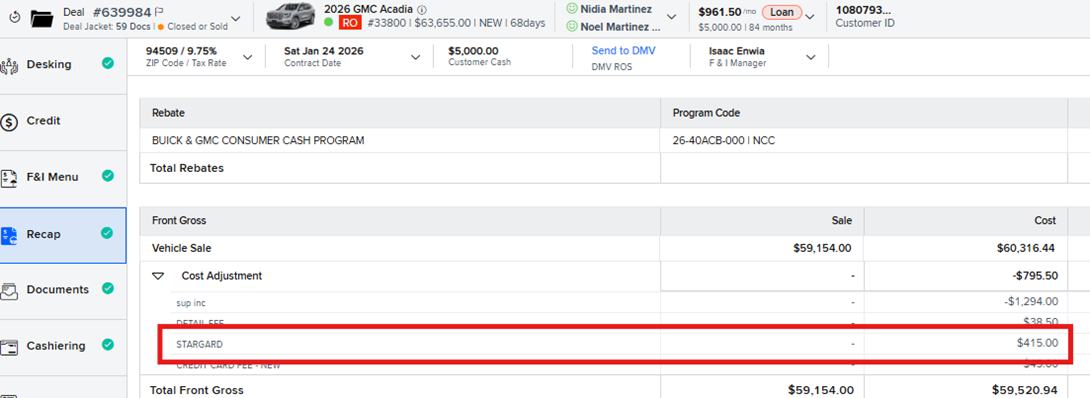 If you encounter a deal where STARGARD is included in the vehicle sale price, it will not be reflected separately on the contract, and the sale cost amount will be included as part of the total vehicle sale amount in the recap.